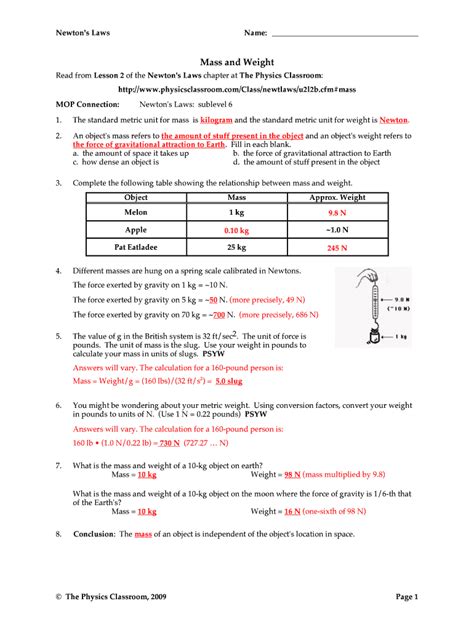 Read Online Mass And Weight Physics Classroom Answers Reader